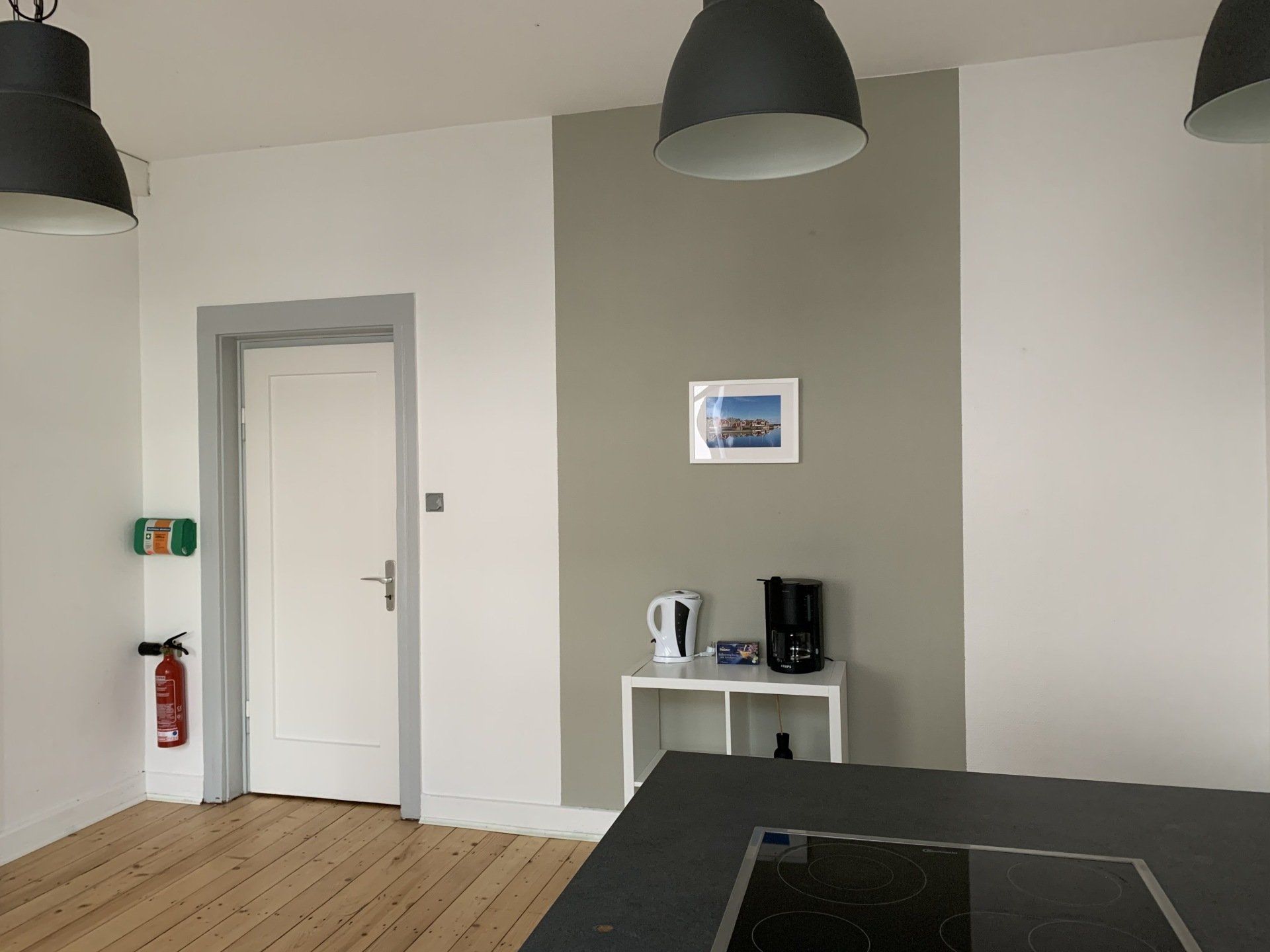 mit Backofen, Kochfeld, Kühlschrank, Mikrowelle, Spülmaschine, Kaffeemaschine und Wasserkocher. Ein Essplatz mit Theke lädt zum gemeinsamen Verweilen ein.